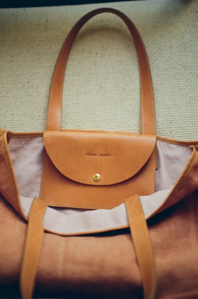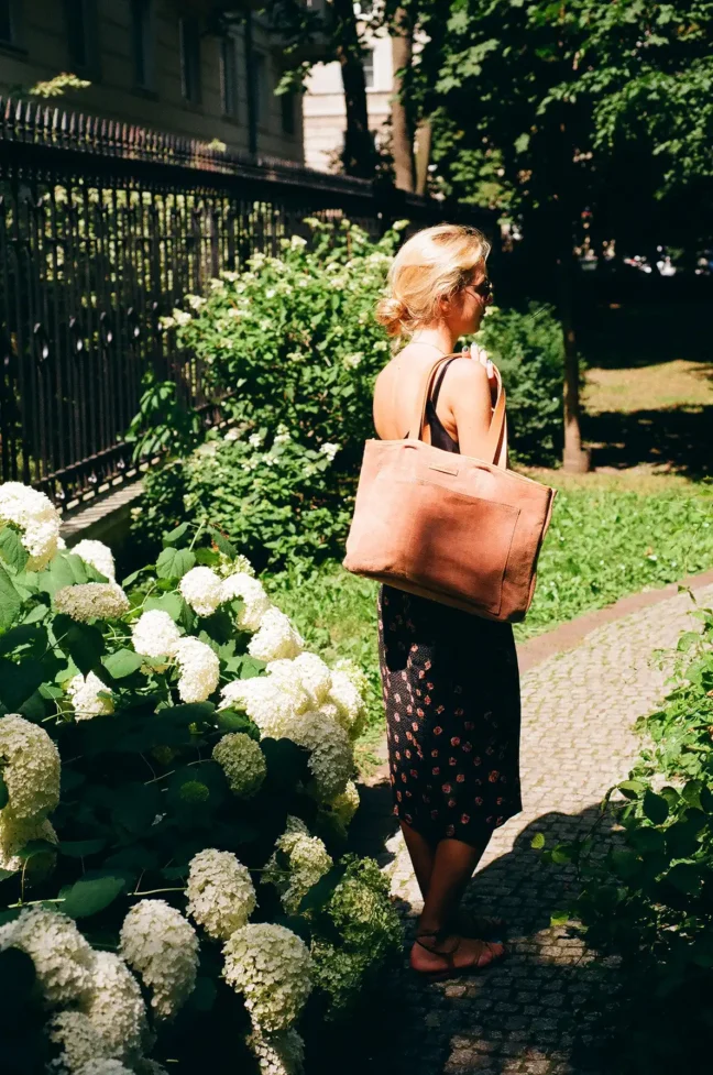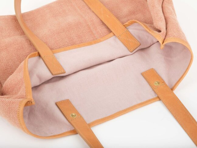 Uszy Lezamy są wykonane z podwójnej, licowej skóry w kolorze piaskowym i są doszyte do torby. Wewnętrzne dno torby jest skórzane, dzięki czemu jest sztywne i mocne. Oprócz tego, cała torba jest obszyta skórzaną lamówką, która nadaje jej wyjątkowego charakteru i pasuje do innych skórzanych elementów w torbie.