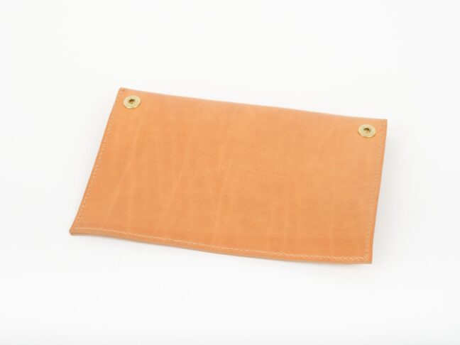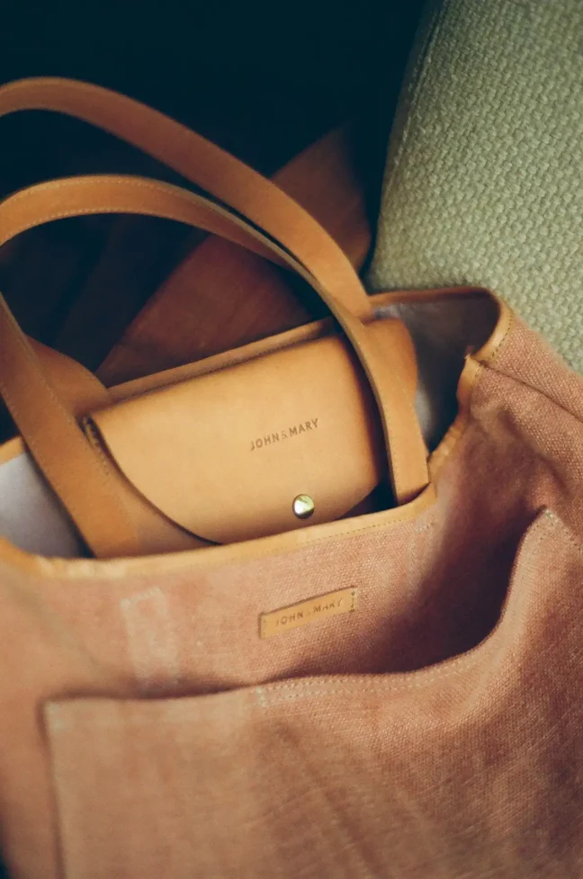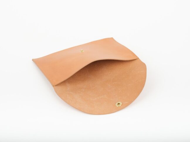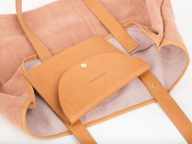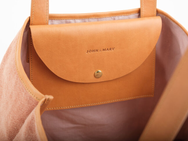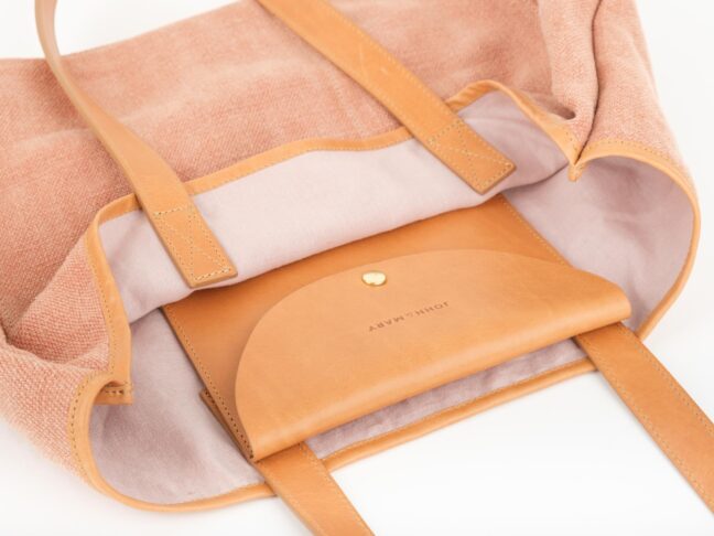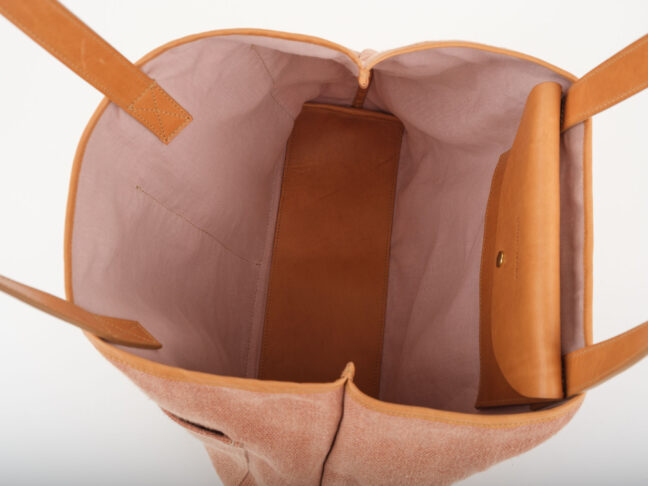LEZAMA ma dużą pojemną kieszeń z przodu, podzieloną na dwie komory. Jedna spokojnie pomieści książkę o formacie A5, w drugą można schować różne drobiazgi. W środku znajduje się jedna skórzana kieszonka z klapką, zapinana na zatrzask, w którą mieści się telefon i portfel. Kieszonka jest przymocowana do torby mosiężnymi zatrzaskami, dzięki czemu można odpiąć ją od korpusu i używać osobno. Wnętrze torby jest wykończone podszewką (len 50 %, bawełna 50 %) w pudrowym kolorze.