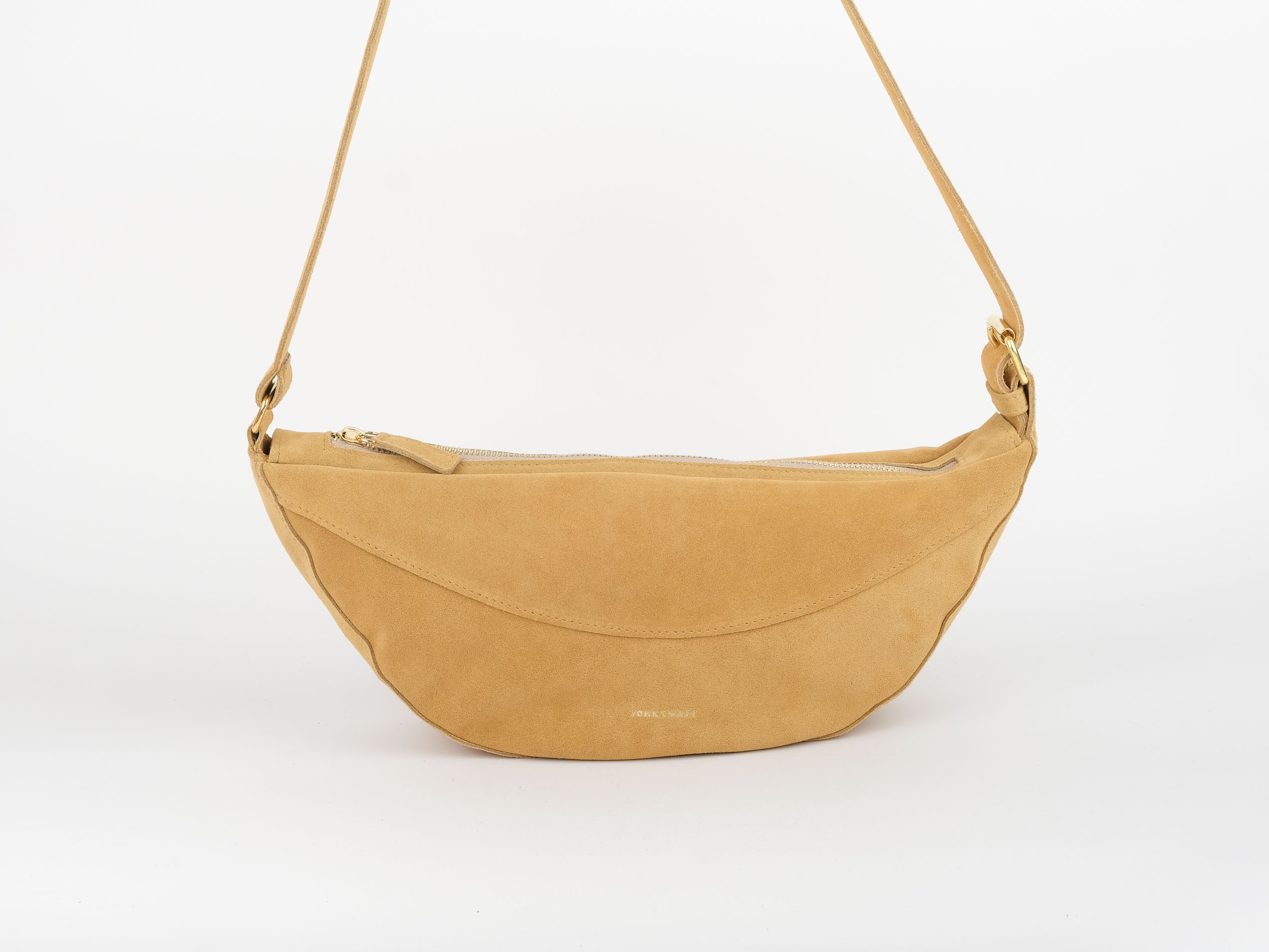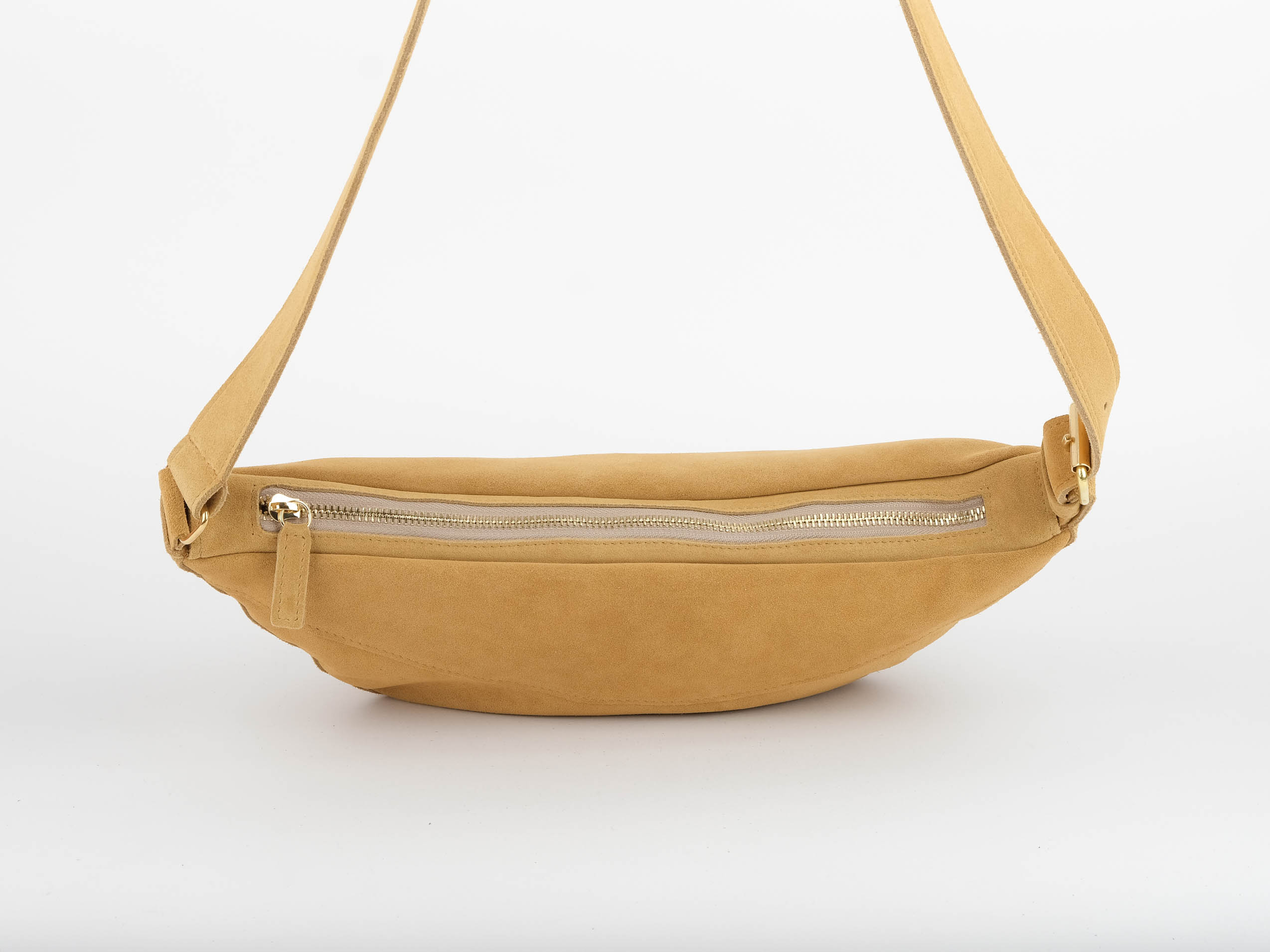 Zaprojektowana tak, aby nosić ją przez ramię z przodu lub z tyłu sylwetki, ale świetnie będzie wyglądać również jako torebka, na ramieniu. Dzięki regulowanemu paskowi dopasuje się do każdej sylwetki, o każdej porze roku, niezależnie od ilości odzieży wierzchniej. Minimalistyczna forma nerki, przypominająca banana sprawia, że pasuje do wszystkiego- spodni, sukienek itd.
